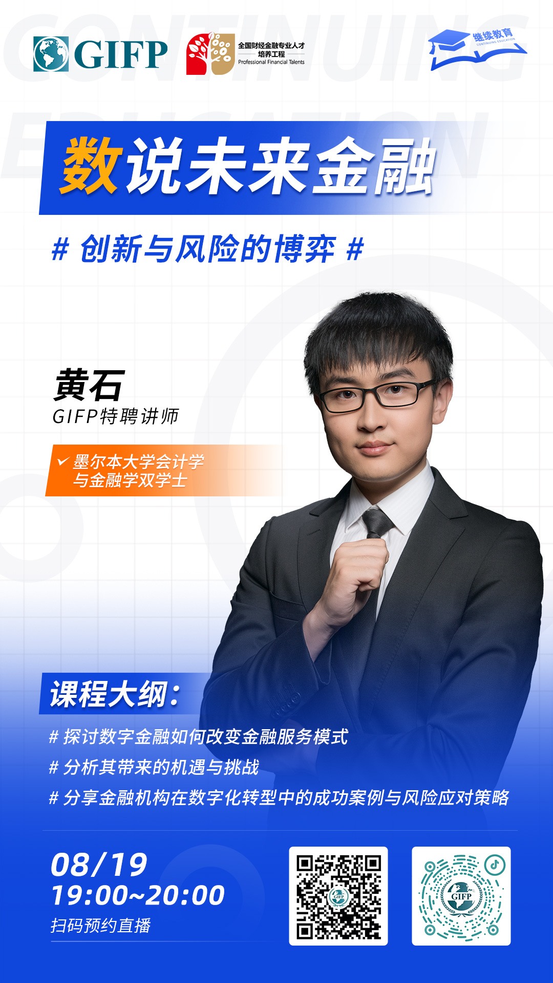 8月19日(周二)晚19:00-20:00,《“数”说未来金融:创新与风险的博弈 》,GIFP中国继续教育直播间,一场不容错过的数字金融前沿对话即将上线! 特聘讲师黄石先生邀您一同深入前沿阵地,探查数字金融未来发展的博弈之道!